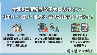 令和8年度税制改正大綱のポイント住宅ローン控除・相続税・登録免許税はどう変わる?【住宅購入者向け】住宅ローン控除の変更点マイホームの購入を検討されている方にとって、住宅ローン控除は最も関心の高い制度の一つでしょう。今回の改正では、制度の延長...