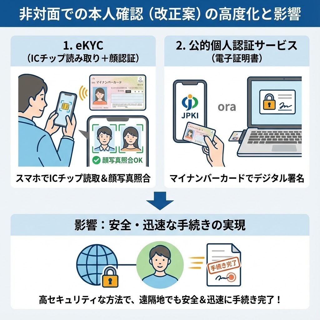 - 影響: 郵送だけで本人確認を完了させることが困難になり、遠隔地のお客様との取引は、より厳格なデジタル手法への移行が求められることになります。